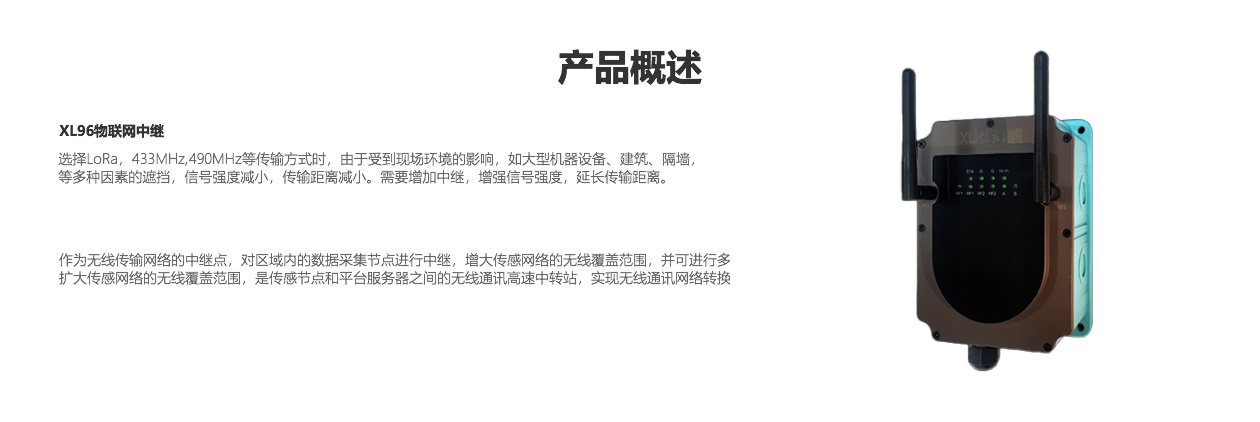 XL96物聯(lián)網(wǎng)中繼,作為無線傳輸網(wǎng)絡的中繼點,對區(qū)域內(nèi)的數(shù)據(jù)采集節(jié)點進行中繼,增大傳感網(wǎng)絡的無線覆蓋范圍,并可進行多級中繼。