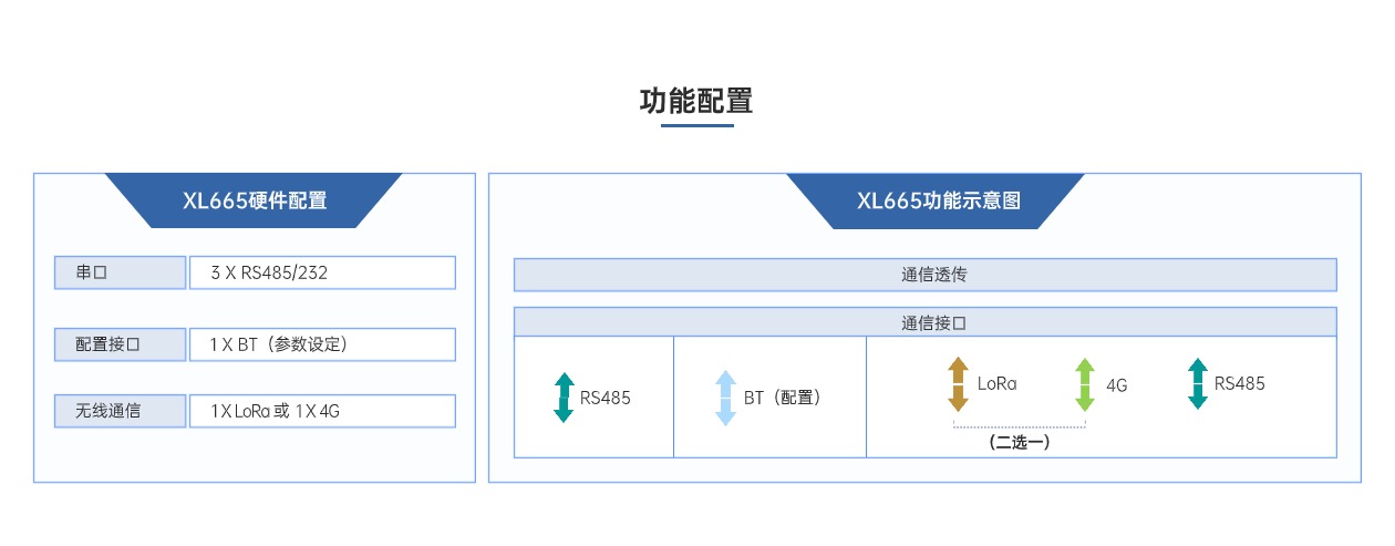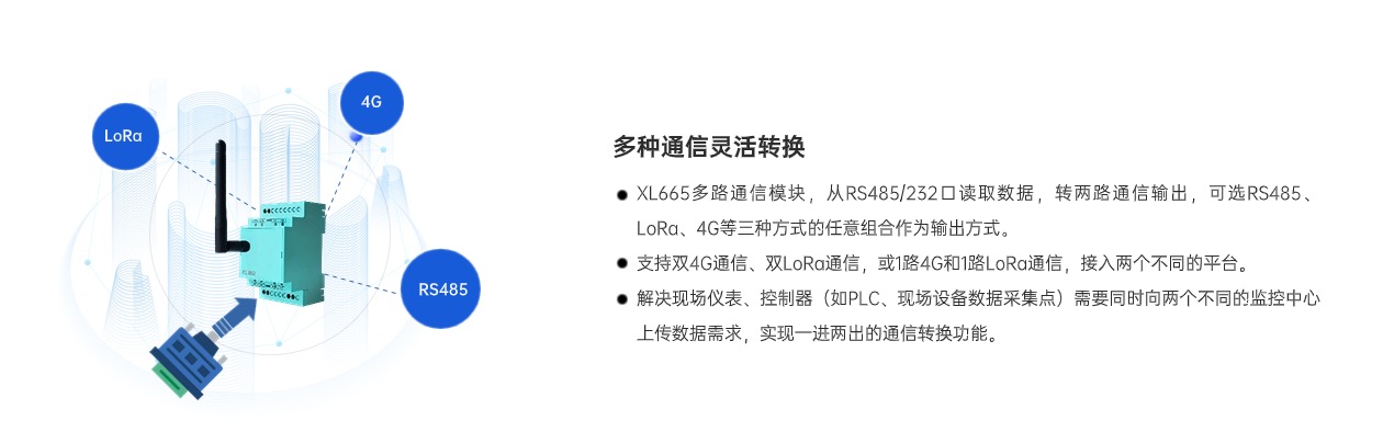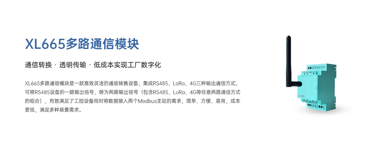 XL665多路通信模塊是一款高效靈活的通信轉換設備,集成RS4852、LoRa、4G三種輸出通信方式。可將RS485設備的一路輸出信號,轉為兩路輸出信號,(包含RS485、LoRa、4G等任意兩路通信方式的組合),有效滿足了工控設備同時將數據接入兩個Modbus主站的需求,簡單、方便、易用,成本更低,滿足多種場景需求。