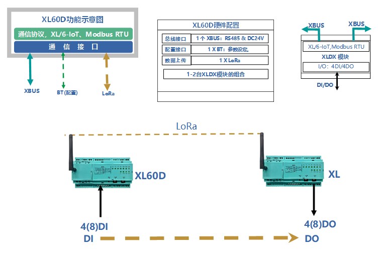 XL60D的通信方式是LoRa無線傳輸方式,每臺(tái)XL60D主機(jī)模塊,最多配兩個(gè)開關(guān)量I/O模塊。
