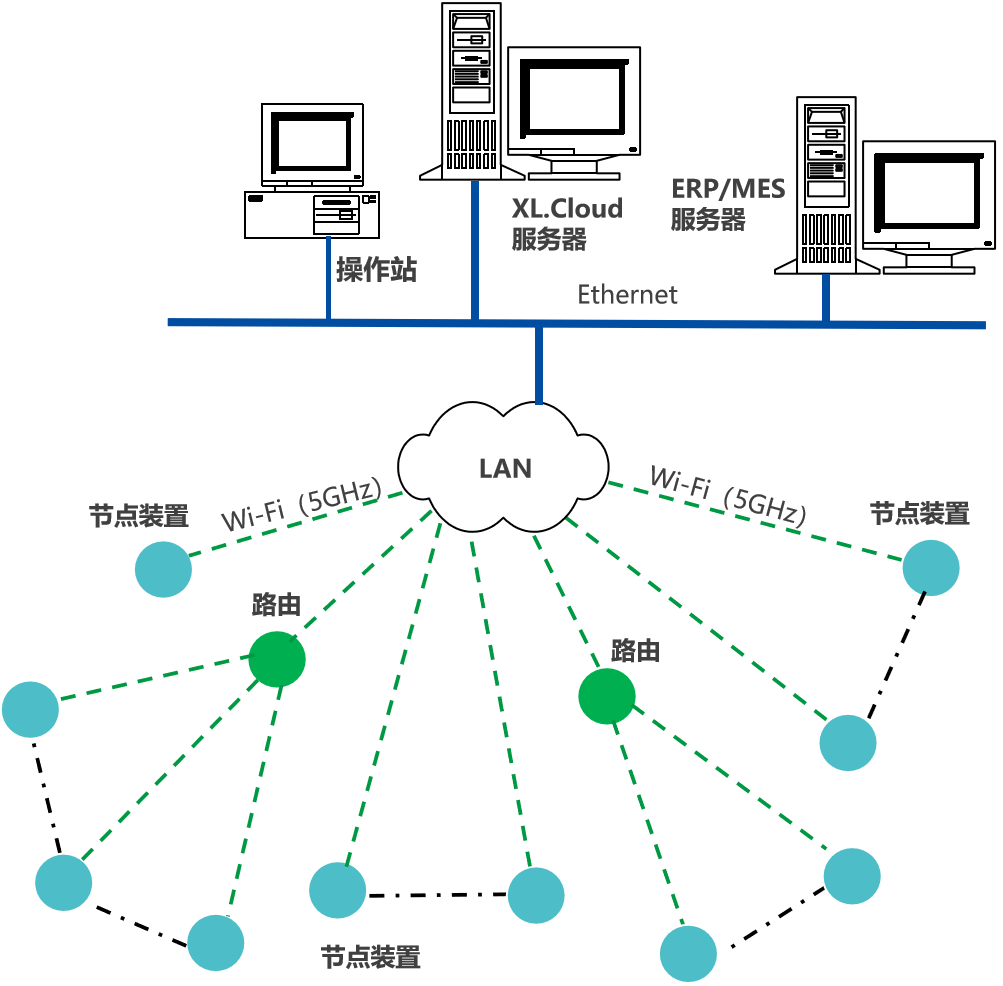 節點裝置(智能采集裝置/智能采集終端),通過Wi-Fi(5GHz),接入企業內部LAN,推送設備生產數據,至企業生產監控平臺