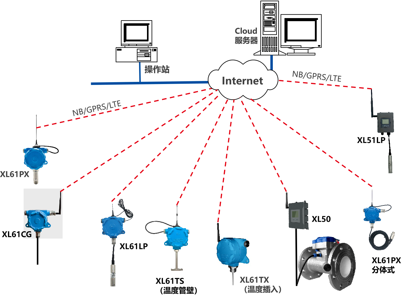 類似泵房、水廠、水源井等場所的數據監測,監測點的數據先上傳至XL90物聯網關,再通過NB/GPRS/LTE轉發數據至云平臺,此種情況,數以后在量大時,可選LTE(4g)方式