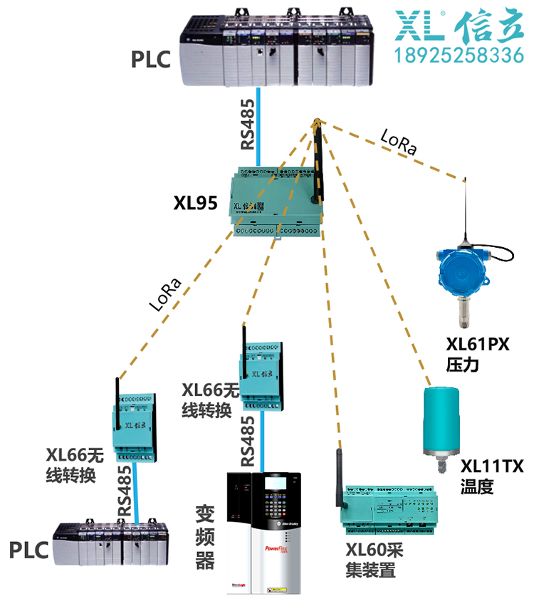 XL9X網關,無線讀取采集節點的數據,通過RS485,Ethernet轉發數據至PLC;