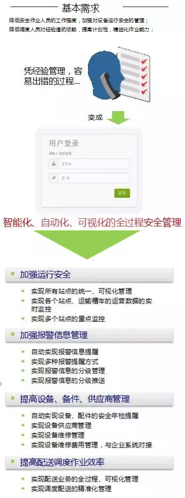 實時動態掌握儲罐運行數據、車輛罐體運行數據、車輛行駛數據、客戶加氣數據、客戶用氣數據等;實現設備遠程無線實時監測、控制及運行異常預警、報警等。