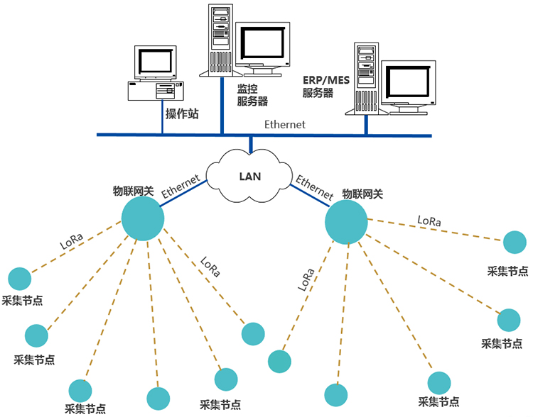每個(gè)采集裝置、傳感器,通過LoRa無線通訊上傳數(shù)據(jù)至物聯(lián)網(wǎng)關(guān),網(wǎng)關(guān)通過Ethernet或Wi-Fi,接入LAN,推送數(shù)據(jù)至企業(yè)生產(chǎn)管控服務(wù)器。