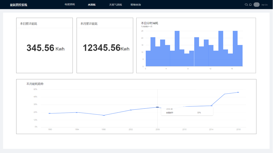能源數據服務器,聯接到展示廳能耗看板,在大屏上更直觀的顯示能耗數據,如本日累計消耗,本月累計消耗,柱狀圖用來顯示本日每一小時的消耗量,曲線圖顯示本月每天能耗變化的情況。效果示意圖如下: