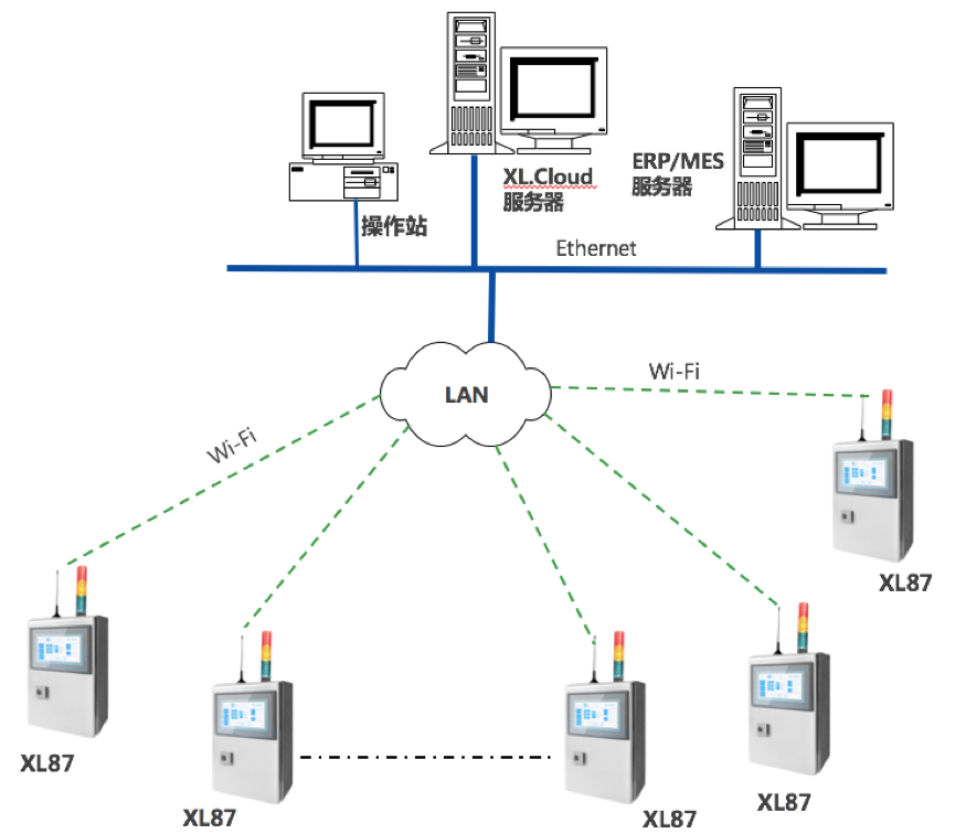 系統(tǒng)由數據采集節(jié)點裝置XL87智能采集終端 、Wi-Fi無線通信網絡、監(jiān)控中心服務器,及工廠數字化平臺XL.Cloud軟件構成;