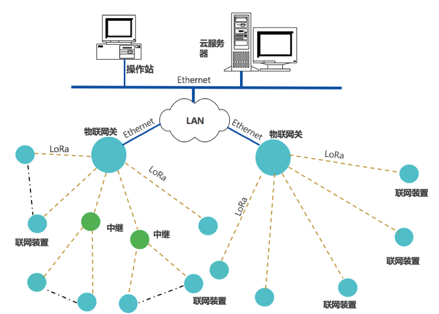 聯(lián)網(wǎng)裝置,采集設(shè)備運行數(shù)據(jù),通過LoRa上傳數(shù)據(jù)至物聯(lián)網(wǎng)關(guān),網(wǎng)關(guān)通過Ethernet或Wi-Fi,接入云平服務(wù)器;
