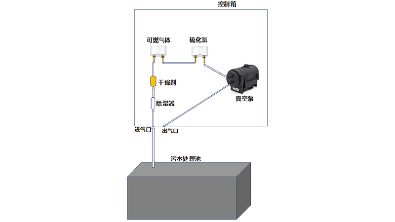 過程:用聚四氟乙烯管,聯接整個氣體通路。管直接伸入污水池,聯接控制箱進氣口,氣體從進氣口,至過濾器、除濕器,至傳感器探頭進、出氣口(兩臺傳感器的進、出氣口串聯),至真空泵抽氣口,從真空泵排氣口聯接控制箱出氣口;
