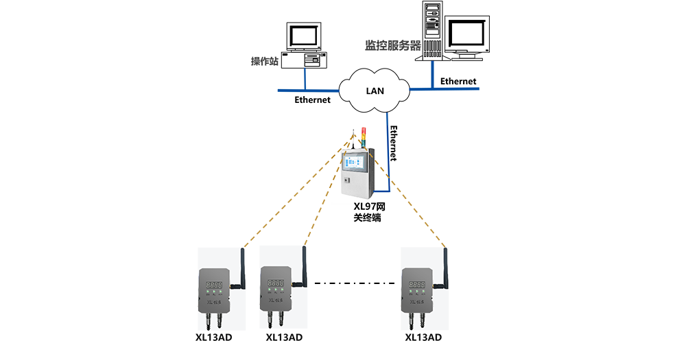 現場需要局部集中監視時,可配置XL97網關終端,讀取區域內XL13AD上傳的數據,分析處理、顯示、報警,并轉發至監控中心服務器。