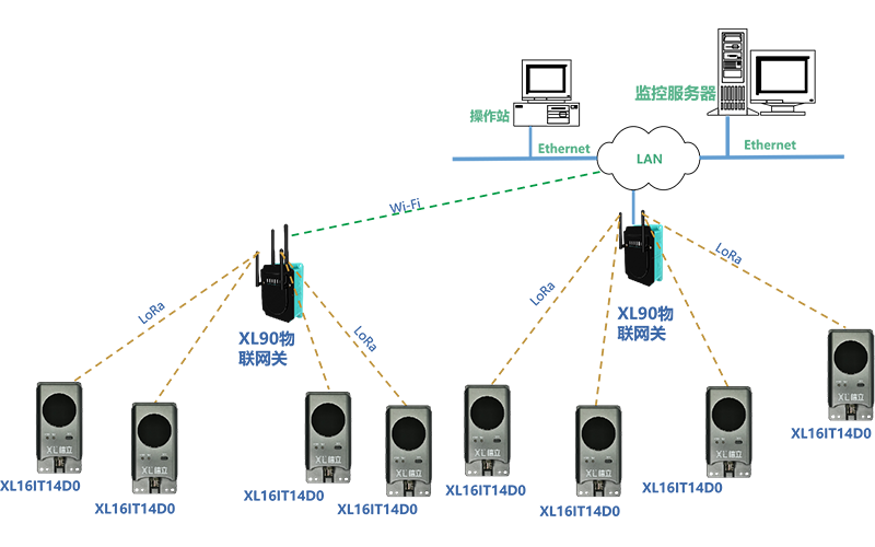 LoRa無線上傳溫度數據,須選XL9X系列物聯網關作無線接收端,通過Ethernet、Wi-Fi、RS485,或4G通信方式,接入溫度監控軟件平臺,支持Modbus RTU/TCP、MQTT、SOAP、寫數據庫,等等通信協議。