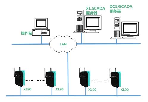 無線接收端選擇XL90物聯(lián)網(wǎng)關(guān),物聯(lián)網(wǎng)關(guān)無線讀取溫度傳感器的數(shù)據(jù),進(jìn)行處理、協(xié)議轉(zhuǎn)換,通過Ethernet上傳數(shù)據(jù)至監(jiān)控服務(wù)器,或接入DCS等其它監(jiān)控平臺(tái)。