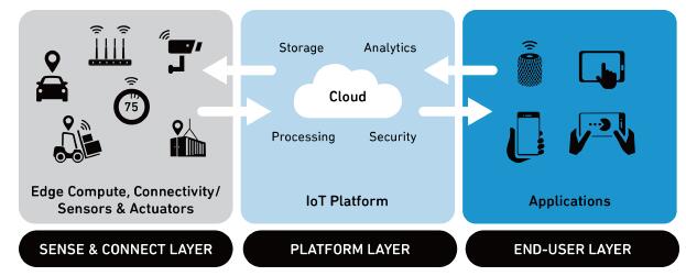 物聯網大致分為3 層。第1 層為感知和連接層,用于將物聯網硬件連接到執行數據處理和存儲的網絡應用。第2 層為平臺層,用于保護、處理、分析和存儲數據。第3層為最終用戶層,最終用戶在此使用應用監控并解讀數據。此外,最終用戶還可以使用應用發送指令。