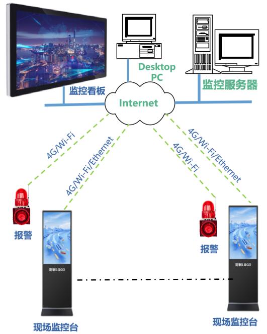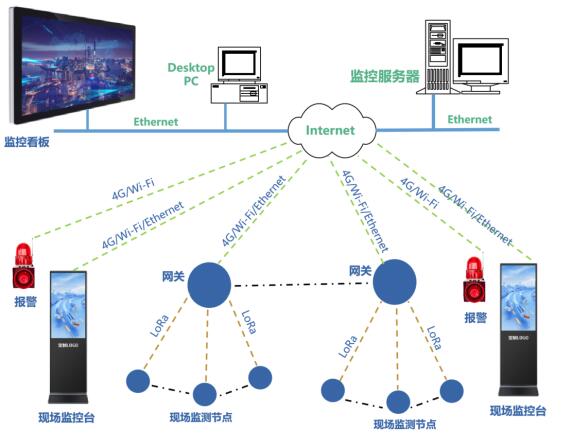 l 根據工地情況,選Ethernet、Wi-Fi、4G等多種方式結合的通信方案,實現平臺監控服務器和網關、看板、現場監控臺、聲光報警器、移動終端等設備的通信。