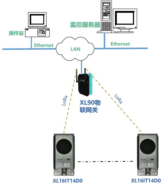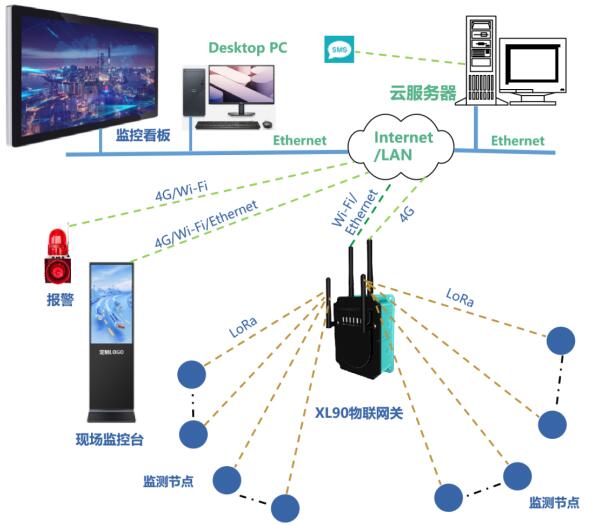 LoRa無線上傳溫度數據,須選XL9X系列物聯網關作無線接收端,通過Ethernet、Wi-Fi、RS485,或4G通信方式,接入溫度監控軟件平臺,支持Modbus RTU/TCP、MQTT、SOAP、寫數據庫等通信協議。 |