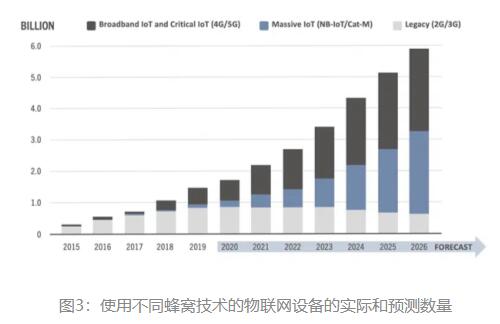 圖3:使用不同蜂窩技術的物聯網設備的實際和預測數量