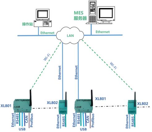 XL80通信主機,從設備通信接口,讀取設備或系統的運行數據,通信協議轉換處理后,再通過Ethernet或Wi-Fi,接入LAN,轉發數據至MES。