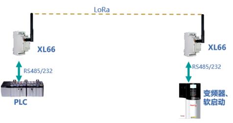 將一對XL66分別與兩臺有RS485/232通信口的設(shè)備連接,實現(xiàn)這兩臺串口設(shè)備的無線連接、通信。