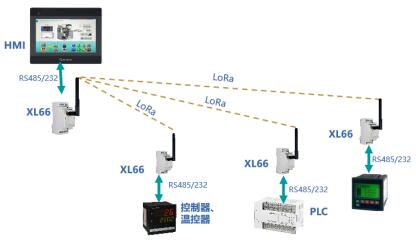一臺XL66與多臺XL66連接,實現(xiàn)一對多,RS485/232設(shè)備間無線通信。