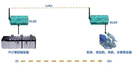 選用一對基于LoRa無線傳輸模塊的XL60無線采集裝置,一臺配置在作業現場作信號接收端,一臺與PLC等控制儀表對接作信號發射端。發射端的XL60將控制儀表的啟停命令,通過LoRa無線對傳到接收端,實現無線遠程控制設備啟、停。