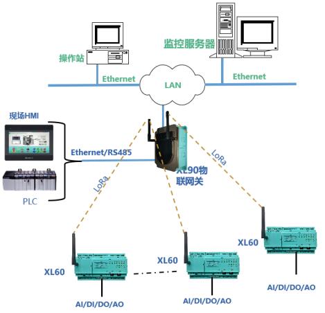 方案一:XL60無線采集裝置采集的現場設備數據,采用LoRa無線傳輸方式,傳輸至XL90物聯網關,經協議轉換后將數據通過Ethernet或RS485上傳至監控平臺、PLC、觸摸屏、控制器等設備。