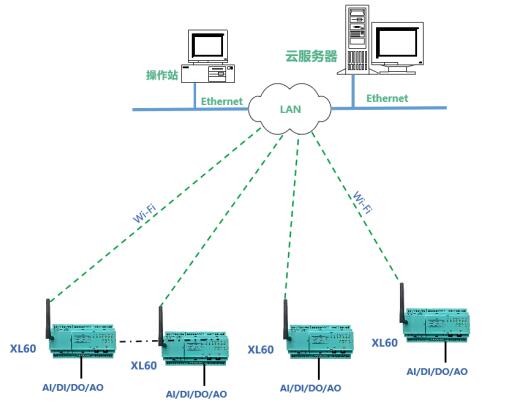 方案二:對于覆蓋Wi-Fi的區域,XL60無線采集裝置可直接通過Wi-Fi接入局域網,通過LAN直接推送數據至監控服務器。