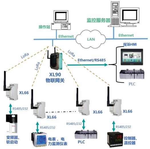 選擇 XL66 串口無線轉換器 ,接入控制儀表、變頻器等設備的 RS485/232 接口,讀取所需數據,無線傳輸至網關節點。選擇 XL90 物聯網關 ,作為無線接收端,轉發數據。