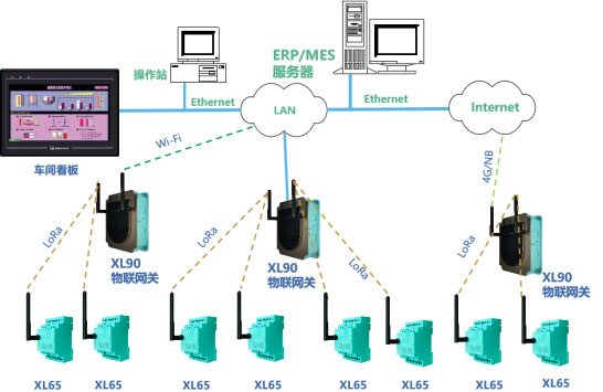 XL65無線采集器,通過LoRa無線通訊上傳數據至XL906物聯網關,網關通過Ethernet、Wi-Fi或4G,推送數據至監管平臺或企業生產管控服務器。