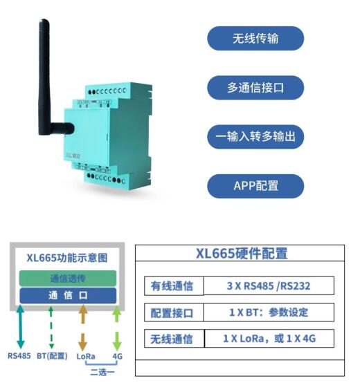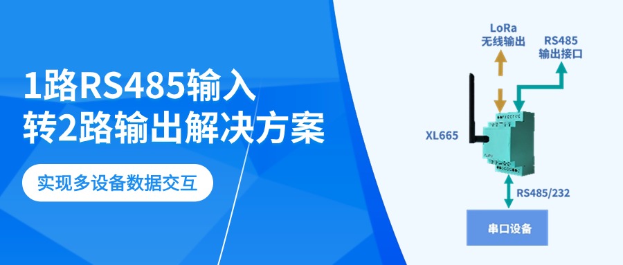 一路RS485信號,經(jīng)由XL665無線轉換器,輸出一路RS485信號和一路LoRa無線信號,同時接入兩個不同的設備(系統(tǒng))。