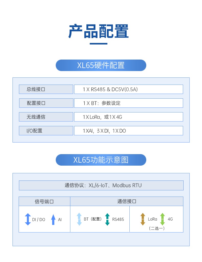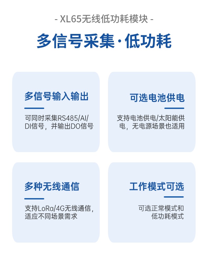 XL65無線低功耗模塊,集成RS485通信口和豐富的I/0口,可實現同時采集1路AI信號、3路DI信號、1路RS485信號,支持多種無線通信方式上傳采集的信號和數據。可選電池供電,適用于更多供電不便的場景。