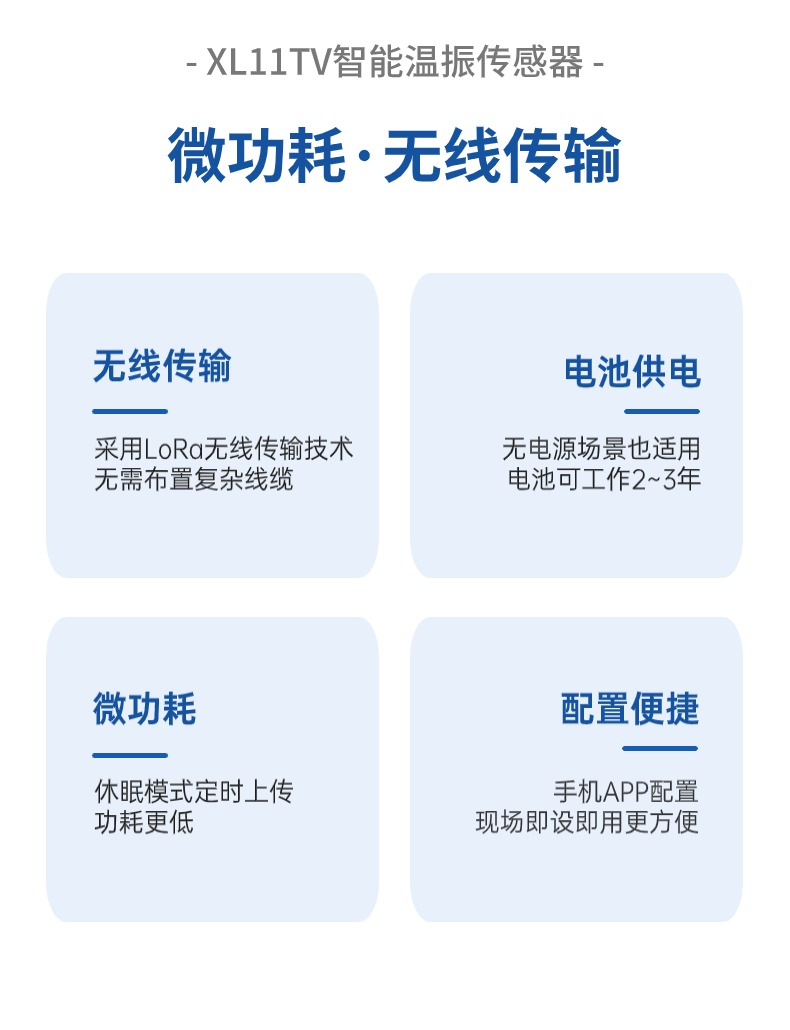 XL11TV溫振傳感器通過振動(dòng) + 溫度雙參數(shù)監(jiān)測(cè),可實(shí)時(shí)捕捉設(shè)備異常信號(hào),結(jié)合監(jiān)控平臺(tái)智能算法實(shí)現(xiàn)智能故障預(yù)警,為企業(yè)構(gòu)建 “預(yù)防為主” 的設(shè)備管理體系提供技術(shù)支撐。