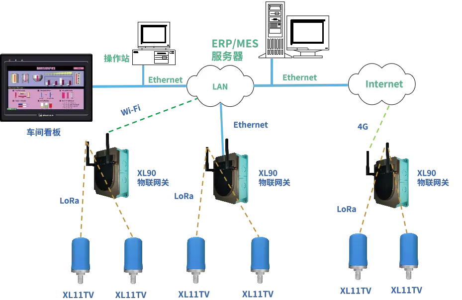 監(jiān)測(cè)系統(tǒng)采用無線傳輸設(shè)計(jì),XL11TV溫振傳感器采用LoRa 無線傳輸數(shù)據(jù)給XL90網(wǎng)關(guān),網(wǎng)關(guān)對(duì)數(shù)據(jù)進(jìn)行協(xié)議轉(zhuǎn)換后,通過Ethernet/WiFi/4G傳輸數(shù)據(jù)至監(jiān)控平臺(tái)。