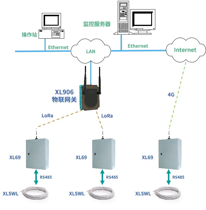 接入企業監控平臺:XL69無線采集終端采用LoRa無線傳輸數據至XL90網關,網關通過Ethernet/WiFi等方式接入監控平臺;